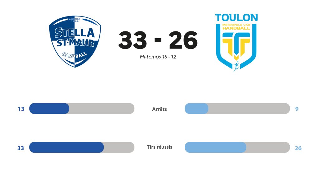 Malgré plusieurs exclusions temporaires, les Stellistes restent soudées, bien organisées et ne laissent aucun espoir de retour à Toulon. L’écart se creuse progressivement jusqu’au score final de 33–26, sous les applaudissements du public.
